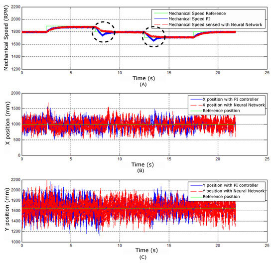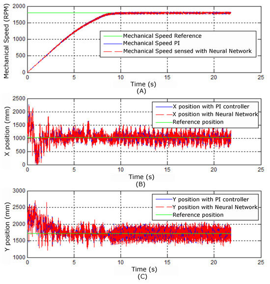 The first experiment presents the system’s behavior when being powered from rest to a rated speed of 1800 rpm. Figure 33 shows the mechanical velocity dynamics and the X and Y positions, respectively, in the function of time operating with the two controllers.