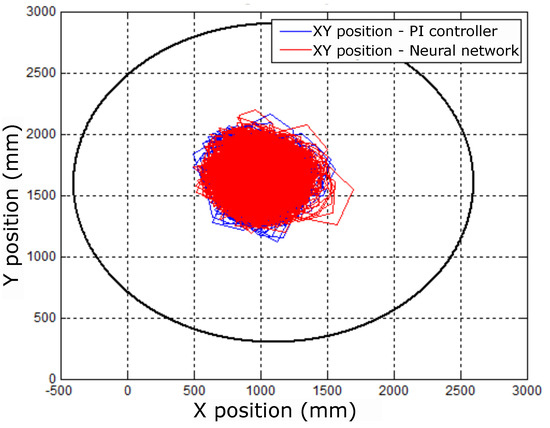 In this case, the presence of overshoots in the performance of the The PI controller was identified with dashed circles, which did not occur with the neural controller. This behavior can be seen in Figure 35 because there were higher amplitudes in the PI control signal compared to the neural control. Despite the variations of the control signal in Figure 36, it can be seen that the position control performed well because the X and Y signs did not suffer variation.