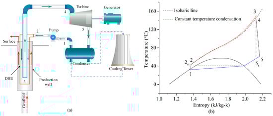 The CO2-based working fluid mixture (in liquid state) from the condenser is pressurized into the supercritical state (processes 1–2) and is then injected into the DHE annular conduit between the inner tube and outer tube. The downward annulus flow of the working fluid absorbs heat from the upward-flowing geo-water outside the DHE, as illustrated with processes 2–3 in Figure 1b. Due to the gravity field, the working fluid absorbs heat with an increasing pressure endothermic process. The inner and outer pipes are connected at the bottom of the DHE, where the working fluid that extracted heat passes upward from the bottom to the top (processes 3–4) in the inner pipe. The working fluid from the DHE enters the turbine to drive the generator for electricity generation (processes 4–5). The turbine exhaust (state 5) flows into the condenser, where it discharges heat to the cooling water until it is condensed into a complete liquid phase (state 1), which is a non-isothermal condensation progress due to the temperature slide of the CO2 mixture. Then, another cycle starts.