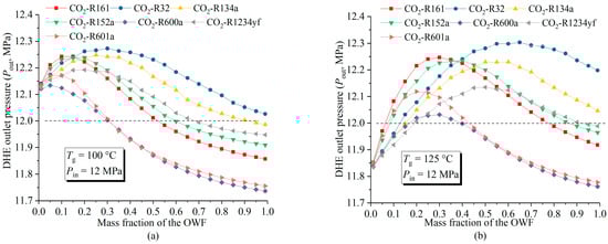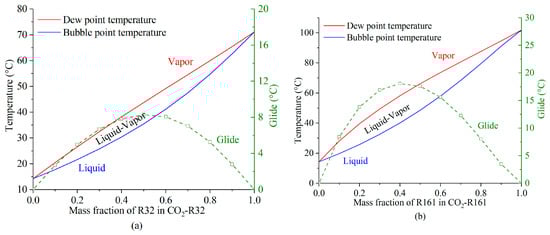 Temperature glide of CO2-based mixtures with changes in the mass fraction of the OWF: (a) working fluid: CO2-R32; (b) working fluid: CO2-R161.