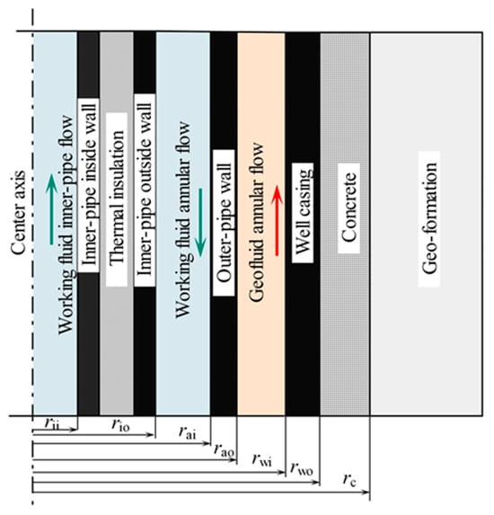 Figure 4 shows the schematic diagram of the DHE and the production well, in which the inner pipe’s thermal insulation layer between the outside and inside walls is filled with adiabatic material. The DHE heat transfer model includes the following aspects: heat transfer between the DHE outer and inner pipes, heat transfer between the DHE and geological formation, and heat conduction in the geological formation. The heat transferred per unit length is as provided in [44]: