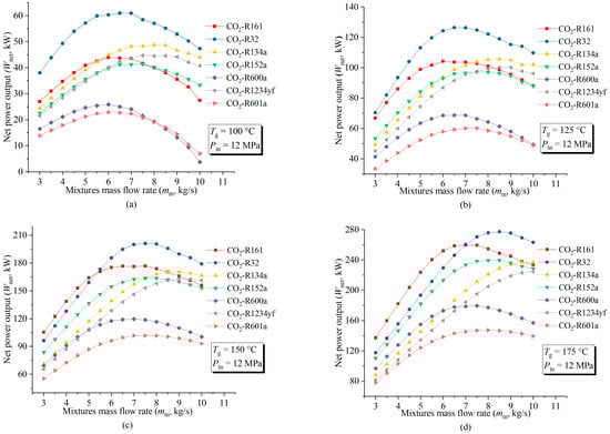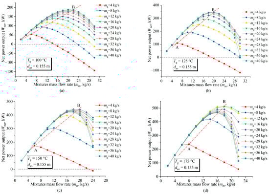 where W represents the power output (kW), and m represents the mass flow rate (kg/s).