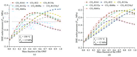 Figure 2 shows the temperature glide of the CO2-based mixtures with respect to the mass fraction of the OWF. The red line represents the dew point temperature, and the blue line represents the bubble point temperature. The difference between the dew point and bubble point is the glide (green dashed line). Each CO2-based mixture has an optimal mass fraction that maximizes the temperature glide.