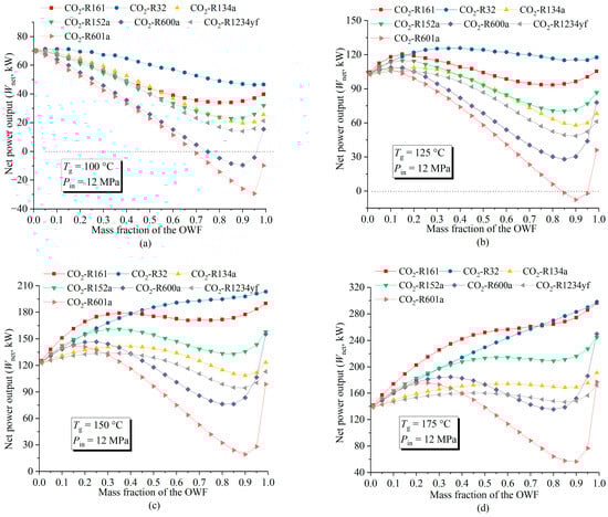 - Comparisons of net power outputs among seven different CO2-based mixtures with respect to different geo-fluid temperatures show that using the working fluid mixture of CO2-R32 has a better thermodynamic performance. Under the geo-fluid conditions (130 °C, 5 kg/s) in the Qiabuqia geothermal field, the CO2-R32 mixture is found to be the best in terms of obtaining the maximum net power output. The optimal working fluid mass flow rate, mass fraction, and inlet pressure are 6.5 kg/s, 0.5/0.5, and 11 MPa, respectively;