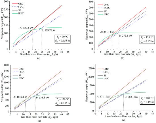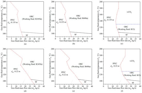 When the annulus-pipe outside wall diameter is larger (dao = 0.22 m), corresponding selection maps were also generated, as shown in Figure 13d–f. It is worth noting that, for a given geo-fluid temperature, the IPEC application scope in each map becomes wider with respect to the upper limit of the geo-fluid mass flow rate, compared with the case when a smaller dao (0.155 m) is used.