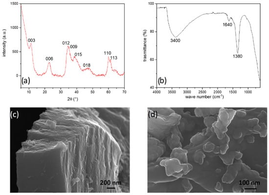 The diffraction pattern of NiFe-NO3, illustrated in Figure 2a, confirms the typical hexagonal layered double hydroxide (LDH) structure (space group R −3 m) [39]. The calculated cell parameters using the WinPLOTR suite [40] are: a = 3.0(8) Å and c = 23.4(9) Å. The broad reflections indicate a small crystallite size and low crystallinity, with symmetric peaks corresponding to basal reflections d003, d006, d009, d110, d113, and asymmetric peaks related to the reflections d012, d015, d018 [36,39,41,42,43]. The presence of asymmetric peaks suggests a turbostratic nature, with different basal planes misaligned, as observed in low-magnification FE-SEM images (Figure 2c). Further examination at high magnification (Figure 2d) reveals the nanostructuring of the material surface.