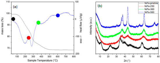 TG-DTA curve (a) and PXRD pattern of NiFe-NO3 and its calcinated compounds (b): black is the NiFe-0, red is NiFe-250, green is NiFe-360, and blue NiFe-560.