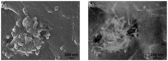 In the NiFe-360 °C, all previously observed peaks vanish, and the pattern results in a few prominent signals indicative of a blend of disordered Ni and Fe oxides. In the case of NiFe-560, different distinct and intense peaks emerge, which can be attributed to the cubic phases Fe2NiO4 (spinel-like) and NiO. This phenomenon is also evident in Figure 4, where the FE-SEM image of NiFe-560 reveals the presence of needle-shaped crystals, characteristic of spinels. The whole process occurring under heating could be resumed as follows: