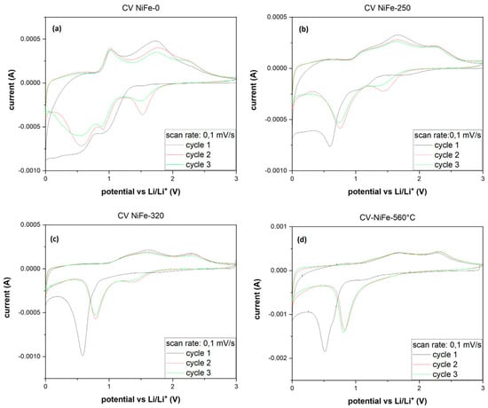 In all four samples (Figure 5), the CV plot exhibits a distinct pattern for the first cycle compared to the subsequent ones. This disparity may arise from irreversible reactions leading to the activation of the material and the formation of the solid electrolyte interface (SEI). Shared peaks are observed across all electrodes: during lithiation, a small and broad peak around 1.5 V and a deeper one at 0.6 V are detected, while during delithiation, common peaks are located at 1.7 V and 2.5 V. In the untreated sample (NiFe-0), as depicted in Figure 5a), an additional peak appears during lithiation at 1 V and during delithiation at 1.1 V. These two peaks persist, albeit with decreasing intensity, from NiFe-250 (Figure 5b) to NiFe-360 (Figure 5c) and completely disappear in NiFe-560 (Figure 5d). Subsequent cycles for all samples display a sharp peak during lithiation at 0.9 V and during delithiation at 1.7 V and 2.5 V. NiFe-0 exhibits additional peaks during lithiation at 1.6 V and 0.5 V and during delithiation at 1.1 V. Although these peaks are retained in the other samples, their intensity diminishes with increasing temperature until they vanish entirely in NiFe-560.