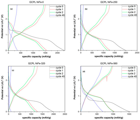 The commonly observed peaks, as extensively documented in the literature [39,44,45], are attributed to the conversion reaction of Ni. Conversely, the additional peaks appear to be associated with reactions occurring at the interlayer, such as intercalation, given that their intensity diminishes as the layered structure decreases. The GCPL plot (Figure 6) reveals a considerable irreversible capacity loss in all samples, approximately 30% of the initial capacity. The curve shape is consistent across all samples; during discharge, there is a prolonged and tilted plateau around 1 V, succeeded by a more inclined one starting at approximately 0.5 V. In NiFe-pristine, an additional tilted plateau at around 1.6 V is evident, and its length decreases in the other samples with increasing calcination temperature. These findings align with the observations from the earlier CV analysis.
