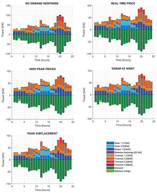 It can be noted that Thermal Generator 4 is only sent when a no-demand response policy is implemented; this is necessary for the significant peak period in which renewables and the other thermal generators are not adequate to meet the demand. In contrast, when any demand-response mechanism is present, it is possible to avoid using Thermal Generator 4 due to demand redistribution.