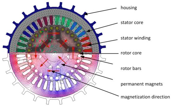 In order to achieve the starting capabilities of an LSPMSM, a cage winding is placed in its rotor. In the rotor core, in addition to the squirrel-cage winding, there are also permanent magnets arranged within the pole pitch, usually in V, U, or W shapes [