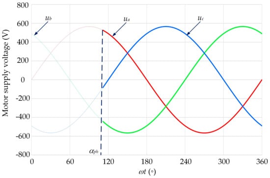 21]. It should be noted that the method of reducing the inrush current by reducing the supply voltage is not suitable for LSPMSMs. This is because lowering the voltage causes a decrease in the asynchronous starting torque, which can lead to stalling of the motor due to the braking torque generated during starting.