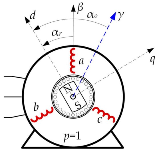 p of pairs of poles in the machine being assumed to be equal to 1 for simplicity in the figure. In the tests, in order to easily compare the results, it was assumed that before the calculations, the rotor was set in such an angular position that the magnetic