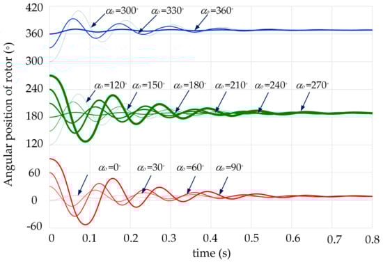 The rotor positioning procedure was implemented under the assumption that the motor load torque was equal to zero. To verify the correctness of the operation of the rotor positioning procedure, the calculations assumed different initial rotor positions α