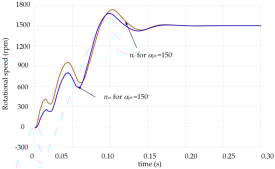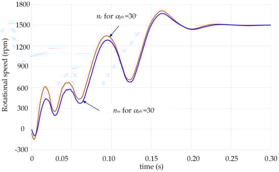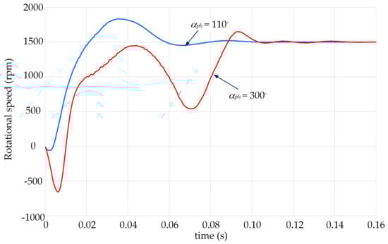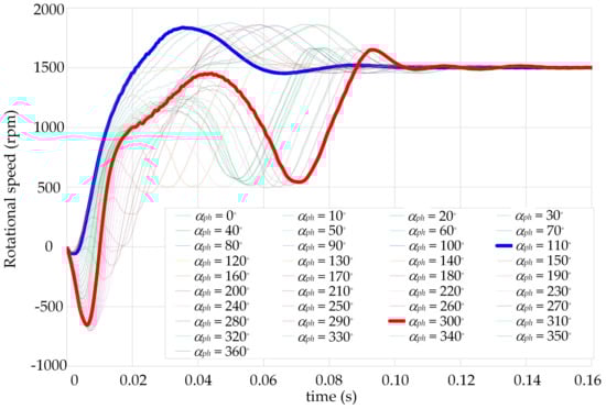 ph equal to 110° and 300°, for which, respectively, the rotor fell into synchronism the fastest, and the start-up took the longest. The speed waveforms extracted from