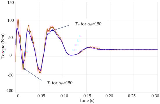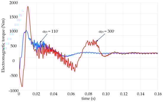 ph = 110°, except for the initial start-up phase, the electromagnetic torque was positive, and its waveform was established faster. Moreover, its amplitude was almost twice as small as the maximum torque value obtained for α