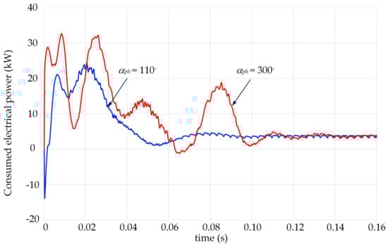 In order to compare the energy intensity of the analysed starts, the total electrical energy consumed by the motor from the grid over 0.16 s was calculated. It amounted to 1508.4 Ws and 1004.6 Ws for angles of 300° and 110°, respectively. The ratio of these energies was about 1.5.