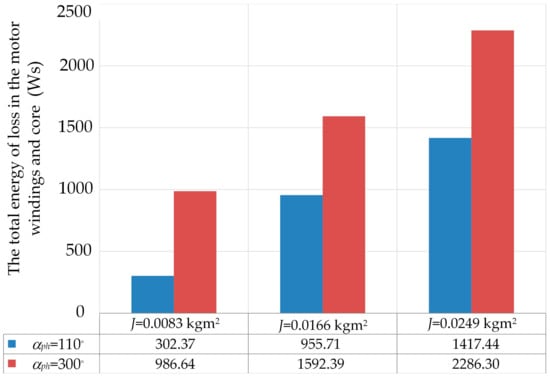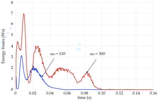 Figure 14. It should be noted that energy was given off in the form of the integration of power losses in the stator and rotor windings, as well as in the core of the machine. When the motor was loaded with a torque of 19.4 Nm, the total energy losses during the start-up of the motor for an angle of α