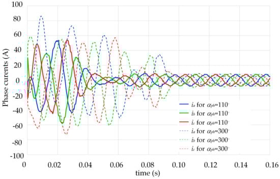 The obtained waveforms confirmed that the maximum current values at successive periods of the supply voltage strongly depended on the angle of voltage switching. The ratio of the maximum values of phase currents at start-up made for αph angles of 300° and 110° was about 1.5. Moreover, the current waveforms for αph = 110° were established after five periods of supply voltage, and for the αph = 300° angle, they were established only after seven periods. Thus, the start-up time was able to be reduced by about 28%.