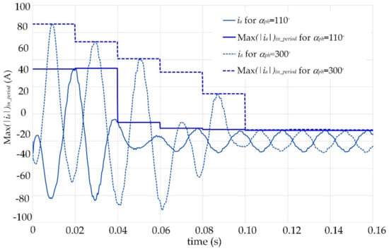 ph = 300°, larger current amplitudes were observed. As discussed in the introduction, due to the higher current values and longer start-up time, the power losses in the motor’s windings increased, which led to an increase in the temperature of the motor components, including the permanent magnets. As a result, the risk of partial irreversible demagnetisation of the permanent magnets increased. In addition, due to increases in voltage drops in the power grid, large inrush currents can more strongly affect/disturb other equipment supplied by the same power grid. To facilitate the comparison of current amplitudes in individual phase windings during motor start-up, a parameter was introduced to determine the value of the maximum current in successive periods of the supply voltage. For example, for phase