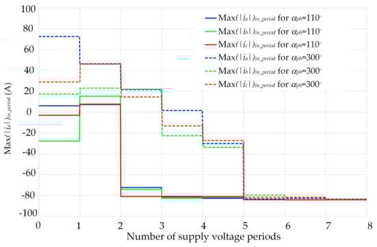 Figure 12. A comparison of the maximum currents in all phases depending on the number of consecutive periods of the supply voltage is provided in