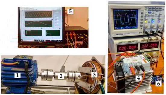 The test bed consisted of (1) the LSPMSM prototype being tested, (2) an MT100-type torque transducer, (3) a water-cooled magnetorheological fluid (MRF) brake, (4) an electronic contactor, and (5) a measurement system equipped with data acquisition cards and a dedicated Virtual Instrument developed in the National Instrument LabVIEW environment. The electronic contactor (4) is switched by a control signal generated by a microprocessor-based control system that was developed (6). The control system measured the line-to-line grid voltage
