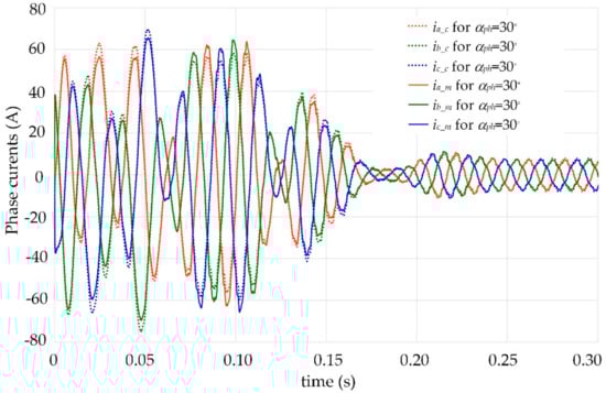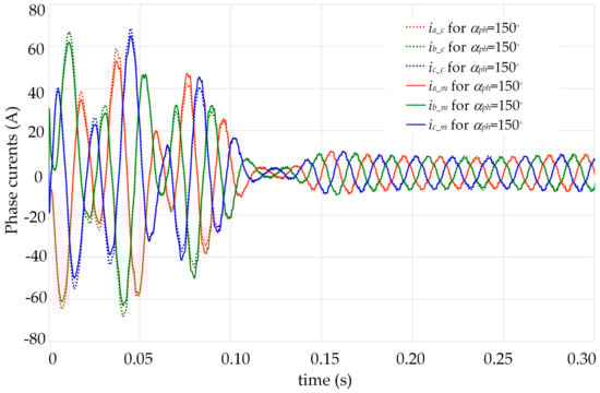 ph on the maximum value of the phase currents when starting a motor loaded with constant torque was small. The analysis of the phase current waveforms showed that the maximum current values for angles of 150° and 30° in the measurements were 64.61 A and 65.55 A, and in the calculations, they were 68.54 A and 69.61 A, respectively. Thus, the maximum current value decreased with respect to the maximum current value obtained for the angle of 150° by only about 1.5%.