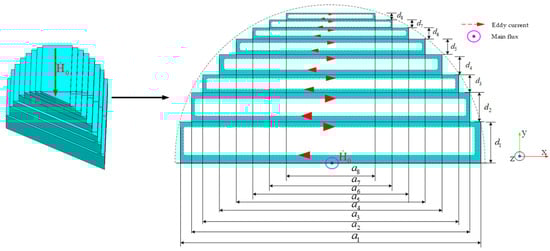 Physical lamination size and eddy current distribution. Where, d1–d8 is the thickness of each stack, a1–a8 is the width of each stack, and is the direction of the main magnetic flux.