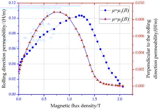 The core of the scaled model adopts 45° full oblique tertiary joints, and the core material of the core and the core material of the flow changing body are 27ZH100 silicon steel sheet. The magnetic characteristic data are measured by the magnetic characteristic test system of the project team. The permeability of x, y and z directions μfx, μfy and μfz are shown in Figure 4.