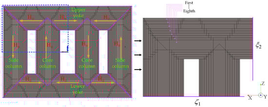 At present, finite element method (FEM) is the most widely used and accurate distributed parameter modeling method, especially in laminated core analysis [,,]. However, laminated core is usually made of millimeter-sized cold-rolled oriented silicon steel sheets, while the overall thickness of the transformer core is usually up to the meter level. If each silicon steel sheet is modeled and simulated, it will face a complex modeling process, huge calculation scale, and even get inaccurate calculation results.