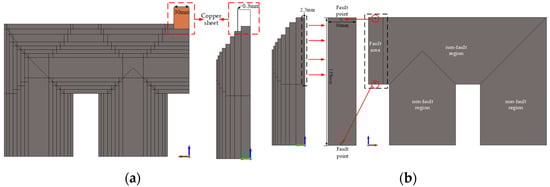 In order to simulate a multi-point grounding fault, a copper sheet with a width of 30 mm and a thickness of 0.3 mm is inserted between the first and second stage of the upper yoke under non-fault conditions, and the copper sheet is set as a single-turn coil and the coil is short circuited to simulate two-point grounding of the core, as shown in Figure 6a. The current value in the post-treatment is the grounding current value, and the Ohmic Loss in the post-treatment is the eddy current loss generated by the core under the two-point grounding fault. In order to simulate the short circuit fault between sheets, the number of short circuit sheets is set to 10, the total thickness of the short circuit is 2.7 mm, the short circuit position is the top yoke of the core, and the short circuit fault between sheets occurs. The short circuit fault area is 135 mm in length and 30 mm in width. Therefore, the simulation model of short circuit fault between core pieces is divided into three parts: non-fault region, fault region and fault point, as shown in Figure 6b.