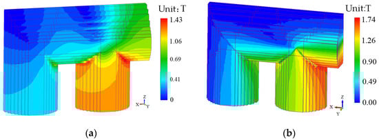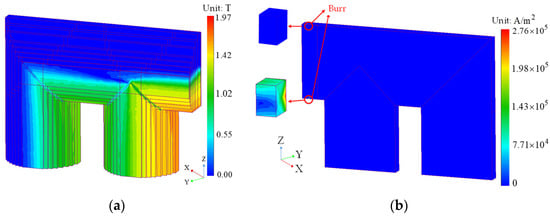 Figure 7c,d shows the distribution of eddy current loss in the non-refined and refined models. Eddy current is mainly distributed at the corner of the core column and the yoke, because the magnetic density change at this corner is large and more eddy current is generated. In the refined model, with the increase of lamination series, the magnetic density of the corner gradually decreases, the eddy current decreases, and the eddy current loss decreases accordingly, showing the eddy current loss distribution.
