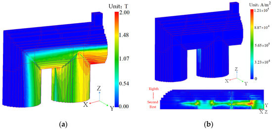 Magnetic density and eddy current under multi-point grounding fault condition. (a) Magnetic density distribution. (b) Eddy density distribution.