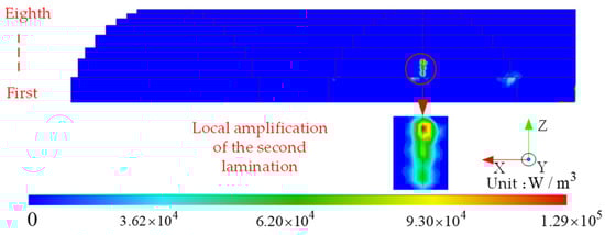 Figure 8 shows the eddy current loss distribution of the multi-point grounding fault. However, the fault current induced by the -Z side of the first and second levels of the upper yoke (the position connected to the main column) is very large. As shown in Figure 8b, the maximum fault current density occurs between the first and second levels of the stack, and the maximum value reaches 1.21 × 105 A/m2. Because eddy current loss is the loss caused by eddy current forming a path in the silicon steel sheet, the distribution of eddy current loss should be basically consistent with the distribution of fault current density. As shown in Figure 9, the eddy current loss density distribution in the second-stage stack is radially diffused outward and reaches its maximum in the center of the second-stage stack, whose value is 1.29 × 105 W/m3. From the fault current distribution in Figure 8b, it can be seen that the fault current passing along the laminate direction gathers at the edges on both sides of the laminate, distributes evenly on the first-and-second-tier laminate boundary (insulation boundary), and converges to the edges on both sides of the laminate along the Y direction after passing through the boundary.