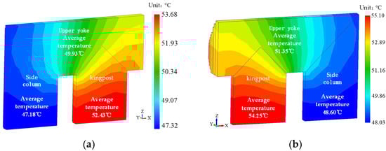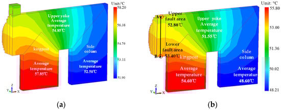 Figure 13 shows the cloud diagram of core temperature under multi-point grounding fault and interlaminar short circuit fault. It can be seen from the diagram that the temperature on the main column under multi-point grounding is the highest, with an average value of 57.85 °C. The temperature of the fault point in the inter-plate short circuit reaches 53.40 °C. Comparing the three figures, it can be seen that the multi-point grounding is a global fault, which affects the overall temperature maximum value and increases the average temperature of the main column, side column and upper yoke of the core. The interlaminar short circuit is a local fault, which basically does not affect the overall temperature maximum value, but only affects the temperature distribution at the fault point.