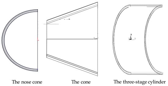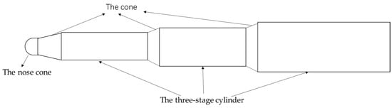Considering the different engineering algorithms of the thermal environment for different geometric shapes, as shown in Figure 1, the typical geometric model of the spacecraft is simplified into five parts: the nose cone, the cones, and the three-stage cylinders (as shown in Figure 2). The different divisions were used for the simulation of the finite element method (FEM).