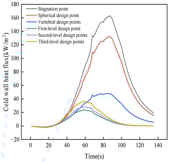 The layers for the aircraft were designed as a common three-stage rocket. Considering the heat flux calculation for the aerodynamic heat, the aircraft is divided into five different regions: the stagnation point region, the spherical region (assuming the central angle 30~90°), the cone region, and the first-, second-, and third-stage cylindrical regions. Each region’s maximum heat flux values were calculated by adopting a relatively conservative design approach to preserve safety margins for the next stage of the TPS design. These calculated values were then applied to the surfaces of the corresponding geometric areas. The resulting heat flux curves for the stagnation point of the spherical head, the spherical head surface, the cone, and the cylindrical plates are shown in Figure 5.