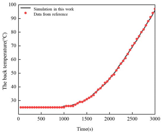 The finite element model proposed in this work was validated using the heat flux data from the reference [28]. A comparison graph of the back temperature curve was obtained through simulation by ANSYS Fluent 17.0. The maximum error of the comparison does not exceed 1.35%, and the simulation results fit well with the data in the reference [28]. The comparison is presented as shown in Figure 7.