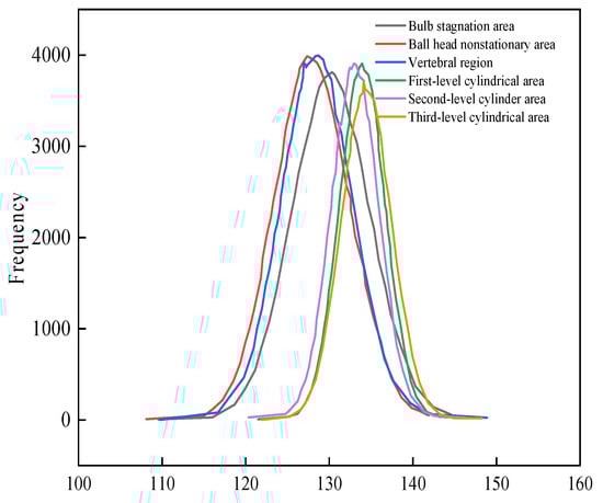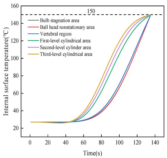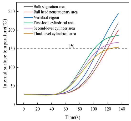 The engineering calculation method that has been verified was used for the determination of aerodynamic heat. In the calculation, the initial temperature was set as 27 °C. The thermal flux was obtained for the first-stage region. The heat flux was then applied to the surface of the thermal protection layer. Finite element transient heat conduction analysis was performed to obtain the temperature field distribution. The process was iteratively repeated to obtain the temperature history curve for the interface of the TPS’s protective layer over the first 135 s of the launcher. The temperature history curves for each stage region are illustrated in Figure 8.