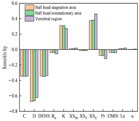 A similar sensitivity analysis was also conducted for the head and cone stagnation areas, with results presented in Figure 12. The results show that coating thickness has the most significant negative impact, with a proportion of 30.02%. This implies that higher values of the coating thickness lead to lower maximum temperatures, indicating better thermal protection system performance. In descending order of importance, the other parameters were the flight speed, the coating-specific heat capacity, the coating density, the coating thermal conductivity, and the Prandtl number. The other parameters were not sensitive to changes in the back temperature of the TPS.