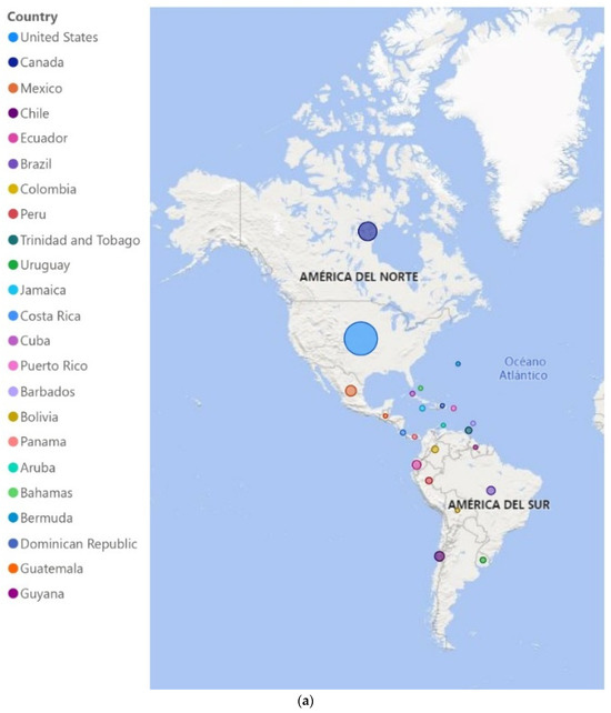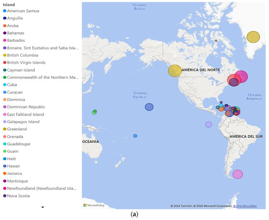 Table 1, below, presents the details of the annual energy produced on each island of the American continent and its renewable and non-renewable fraction. Figure 2a shows a general compilation of the islands that are dependent on each country. In Figure 2b, we observe that the United States is the country with the largest renewable component on its islands with 1084 GWh per year, followed by Canada with 280 GWh per year. An important contribution is also made by Mexico and Chile with 63 GWh and 49 GWh, respectively. The other islands of the continent contribute to decarbonizing the planet, but according to their economic possibilities and energy potential. The Caribbean Islands, among all of them, also have a significant contribution of around 22 GWh annually, which is not insignificant. In South America, the deployment that Ecuador, Brazil, Colombia and Peru are beginning to carry out is also important in relation to the attention they provide to their islands with the incorporation of renewable energy sources, especially based on wind and solar photovoltaics.