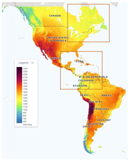 Solar photovoltaic power potential in America, analyzed using the free software Global Solar Atlas [95].