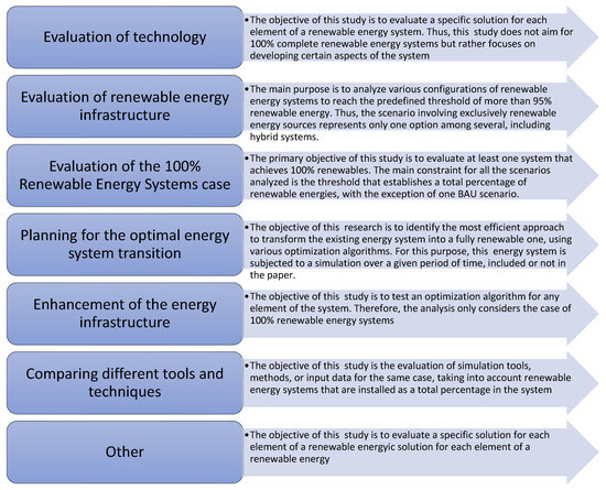 The aspects that this research brings together are focused on analyzing future proposals with 100% renewable energy, with the approaches varying between studies (see Figure 7); however, we highlight the research that has the purpose of decarbonizing the islands, in this case, in the American continent.
