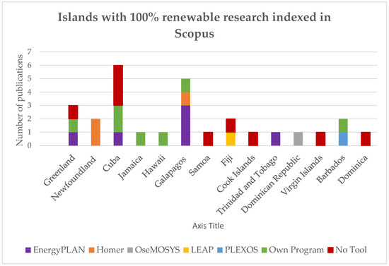 From this, it follows that of the islands that have the most publications in Scopus, and especially in which roadmaps have already been made for decarbonization processes including 100% renewable energy, two places stand out on the American continent: Cuba, with six investigations, and that of Galapagos, with five. It is also important to highlight the studies carried out in Greenland (three publications), Fiji, Newfoundland and Barbados with two publications on each island, and Jamaica, Hawaii, Samoa, the Cook Islands, Trinidad and Tobago, the Dominican Republic, the Virgin Islands and Dominica with a publication on each island. The above are shown in Figure 8.