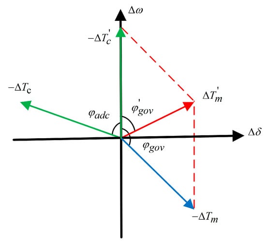 Schematic diagram of phase compensation, where represents the mechanical torque output, φgov represents the initial phase angle difference, represents GPSS output torque, φadc represents the phase angle compensated by GPSS, represents the equivalent torque by GPSS, represents the mechanical torque output after compensation, and represents the phase angle difference after compensation.