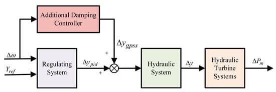 In normal operating conditions, the of the speed regulation system was located in the fourth quadrant, forming an angle φgov with the speed deviation. Under these circumstances, the system demonstrated negative damping characteristics. When GPSS was added to the speed regulation system, the increased input torque was . The vector addition of and generated , located in the first quadrant. In this case, projected onto the -axis was positive, indicating that the speed regulation system had transitioned to positive damping. The structural design of GPSS, employing a composite control approach, is illustrated in Figure 5, as informed by the preceding theoretical analysis.