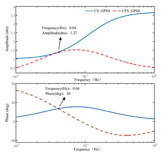 To investigate the superiority of the proposed method, comparative analysis and discussion were conducted on the dynamic performance and PFR performance of the CFS_GPSS and CS_GPSS. Specifically, when the compensation target frequency was set to 0.04 Hz, an in-depth examination was performed on the amplitude-frequency characteristics and phase-frequency characteristics of both controllers. The parameter values for the CFS_GPSS were configured as follows: KL11 =KL22 = 1, T1 = 3.025, T2 = 3.63, T9 = 3.63, T10 = 4.356.