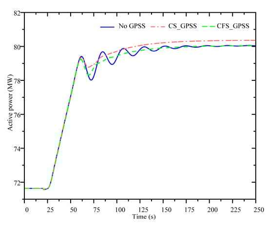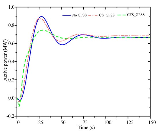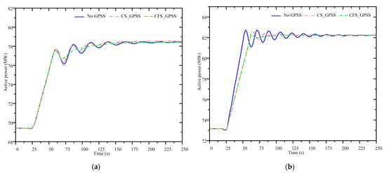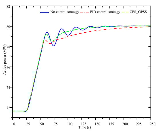 The performance of frequency regulation was investigated under operating conditions 2 and 3 in a similar manner. Figure 14 illustrates the active power. It can be observed that both the CS_GPSS and the CFS_GPSS could effectively enhance the PFR performance of the system. Notably, the frequency regulation performance of the CFS_GPSS control strategy surpassed that of the CS_GPSS method. In operating conditions 2 and 3, the stabilization time for PFR was reduced to 88 s and 40 s, respectively, and the oscillation period was shortened to half a cycle.