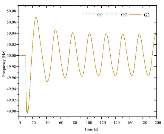 Additionally, in order to further investigate the oscillation suppression performance of the CFS_GPSS across a wide frequency range, load disturbances were conducted under operating conditions 2 and 3. The frequency variation curve of generator G1 during these two operating conditions is illustrated in Figure 12.